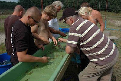 Of ziet Jos nog een mooie. ‘Kijk deze dan jongens, waarom zwemt die er nog?’ Dergelijke vragen stelt Jos veelvuldig tussendoor en alhoewel hij ons in het begin telkens weer in onzekerheid wist te brengen, was het nu het zelfvertrouwen en de reeds opgedane kennis en ervaring die ons resoluut deed wijzen op de lakende glans als reden van weigering.’ Toch laat ons Jos ons grotendeels ongemoeid. Hij heeft vertrouwen in ons en dat voelt goed. Er is ook veel humor tussendoor en ook dat is belangrijk. Want zonder dat je het door hebt, ben je zo enkele uren verder, waarbij concentratie een continue vereiste is. Een beetje humor tussendoor maakt dit mogelijk. ‘Hé, woarum zwemte dieze der nog?’, zo spreekt Ernst ons met zijn allerbeste Jos-imitatie resoluut aan. Hij doet dit echter enkele seconden nadat er net een nieuwe selectielichting in de bak is losgelaten. We verschieten in de lach. Ernst kijkt ons verbouwereerd aan en valt niet uit zijn rol.  ‘Hier, en deze dan, die kan wel door toch zeker’. ‘Moet je kijken wat een glans’, zo stelt hij wijzend op een overmaatse kikkervis… Terwijl Marco gruwelt van deze glibberige groene, kan ook hij het lachen niet laten.
