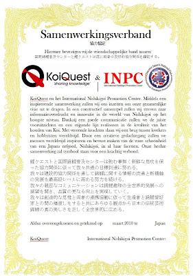 Zo, zondag was een rustdag. Geen kwekers bezocht, maar ’s avonds even uit geweest en de volgende morgen uitgeslapen tot een uur of twaalf. Na een uitgebreide brunch even wat boodschappen gedaan en ’s middags nog wat computerwerk verricht. Rond een uur of zes had ik afgesproken met Hiroshi Toyama om onder het genot van het Japanse eten te praten over de mogelijkheden tussen de INPC (International Nishikigoi Promotion Center) en KoiQuest. Na een uitgebreide maaltijd en gesprek is het duidelijk dat de INPC ongeveer eenmaal in de maand ons gaat voorzien van unieke en 100% up-to-date informatie van de kwekers uit het Niigata-gebied. Daarbij kunnen we hen alles vragen, dus ook jij als lezer kan een directe vraag aan een kweker uit Niigata stellen. Hiroshi zal zich binnenkort zelf voorstellen op het blog, vanaf dan zal ook maandelijks informatie van de INPC beschikbaar worden gesteld. Een heel mooi iets dus, waarvan de gehele koihobby kan profiteren. De kennisdeling van diegenen die zich hun hele leven wijden aan de Nishikigoi, betere informatie kan er toch niet zijn? Om de samenwerking met het INPC kracht bij te zetten, heeft KoiQuest vanuit Nederland voorbereidingen getroffen middels een certificaat en een kunstobject, zie foto’s.