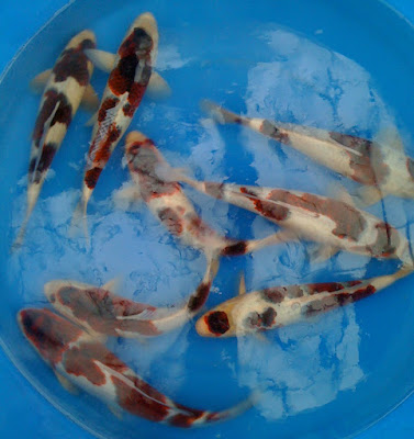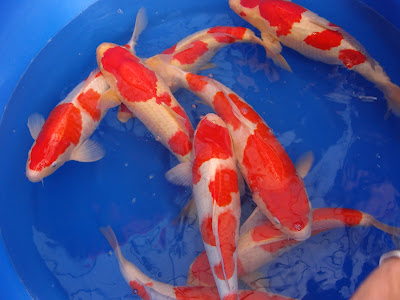 showa zwemmen die na overleg met Shigeru Mano gezelschap kreeg van nog 3 anderen. Een leuk en leerzaam proces om van dichtbij mee te mogen maken. Shigeru Mano spreekt een beetje Engels maar Rob spreekt meer Japans dus was het goed mogelijk voor ons om te converseren over de voor- en nadelen van de verschillende top koi die net gebowld werden. Uiteindelijk heeft Ronald twee van de vier gekocht waarvan de potentieel rijkste (probeer die eruit te vissen:)
