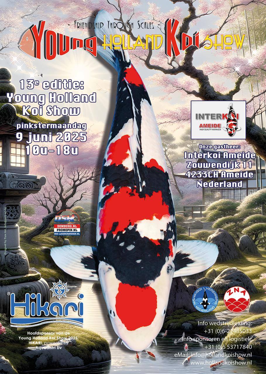 Tweede pinksterdag 9 juni 2025 markeerde de 13e Young Holland Koi Show (YHKS). De Young staat zoals de afbeelding doet vermoeden niet voor jeugdige deelnemers maar dat er Koi mogen worden ingezet tot maximaal 63 centimeter. De locatie, Interkoi Ameide, vormde een idyllisch decor waar de liefde voor Nishikigoi centraal stond. Gastheer André de Groot en zijn familie boden niet alleen hun terrein aan, maar creëerden een ambiance die de passie van het gezin weerspiegelde. Een initiatief waarin toewijding en familiewaarden samensmolten met de schoonheid van de hobby.