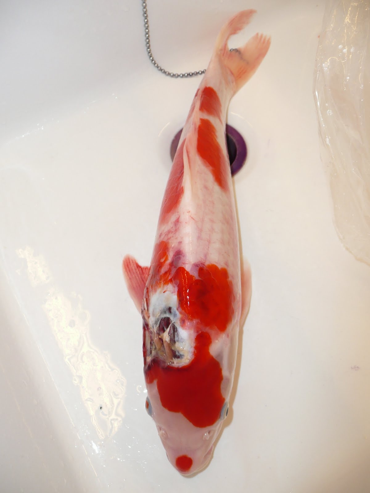 De parasieten huidworm, kieuwworm, costia, chilodonella en zelfs trichodina werden op deze Kohaku gevonden. Daarnaast is de gatenziekte aanwezig, welke voornamelijk door de Aeromonas of Pseudomonas-bacterie wordt veroorzaakt.