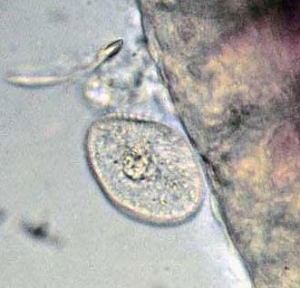 Trichodina is een cilliaat (trilhaardiertjes; eencellige diertjes, die zich d.m.v. trilharen voortbewegen) en hecht zich middels zijn ‘haken’ aan de slijmhuid en kan op deze manier beschadigingen geven aan de vis.