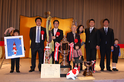 Groepsfoto van de winnaar met kweker en dealer tussen alle gewonnen prijzen, van links naar rechts (uitgezonderd van de jongste pupillen): Shigeru Mano, Ryuki Narita, Kato-san met echtgenote, Futoshi Mano en Hiroshi Mano.Â